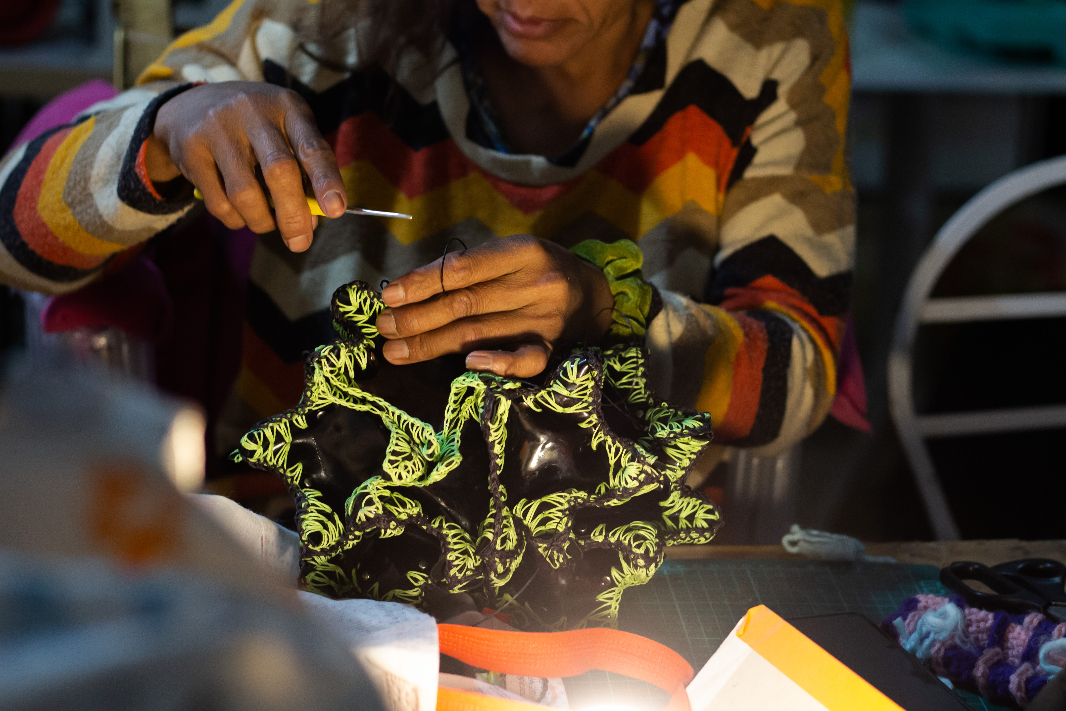Ante la escasez de espacios de contención y oportunidades laborales, articulamos con diversas instituciones con perspectiva trans-feminista para proveer oportunidades creativas y expositivas. Ponemos en valor las formas artesanales de producción y promovemos la concientización sobre el reciclaje, desarrollando métodos específicos de reconversión de residuos en indumentaria y accesorios customizados.